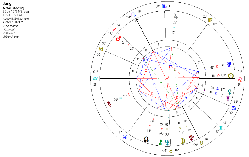 Além disso, sabe-se que ele teve outros casos amorosos ao longo desse tempo. Não foi sem razão que o ferino jornalista Paulo Francis disse a respeito de Jung “O homem era um príapo”, o que também não deixa de ser compatível com Sol em Leão na 7, Marte em Sagitário e Mercúrio conjunção Vênus no mapa do famoso psicanalista.